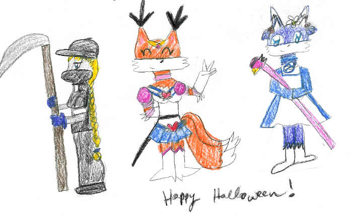 All my digimon in Halloween attire. Foxinmon is Eternal Sailor Moon, Ladywizardmon is Duo Maxwell, and Kimon is Sakura from Cardcaptors